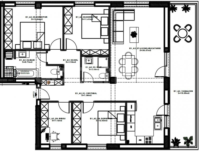 Suprafata totala este de 136mp din care 100mp utili plus terasa de 20mp cu acces de la living si de la bucatarie.