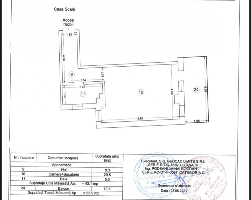 Suprafata construita de 62.5 mpc, utila 54 mp (43 mp + 11 mp terasa ) si este compus din living cu bucatarie deschisa ( 30 mp ) cu acces catre terasa, baie si hol.