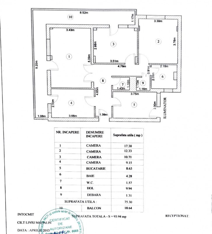 The total built area is 112 sqm, usable 94 sqm and consists of living room 17.38 sqm, closed kitchen 8.63sqm, bedroom 1 - 12.33 sqm, bedroom 2 - 10.71 sqm, bedroom 3/ office 9.15 sqm, bathroom 4.28 sqm, bathroom 1.57 sqm and closed balcony 18.64 sqm.